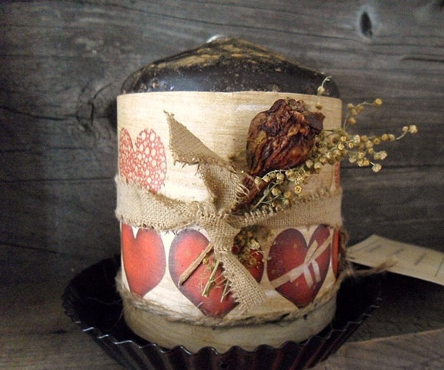 4 Inch Orange & Cinnamon scented Pillar Candle. Each candle has been dipped in black wax, painted with cinnamon and decorated with printed tea stained Heart print and tied off with twine, Sweet Annie and a rose hip sprig